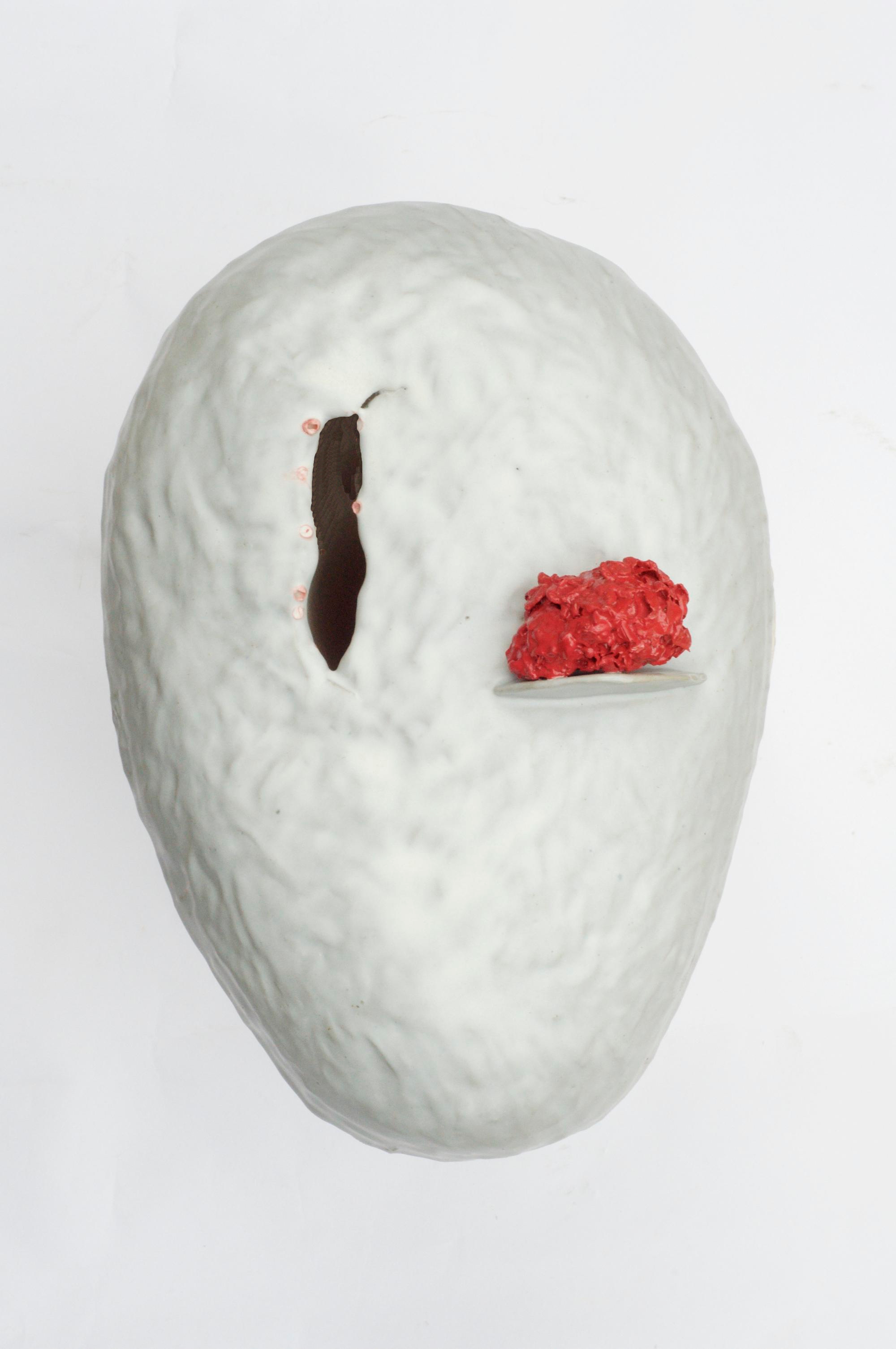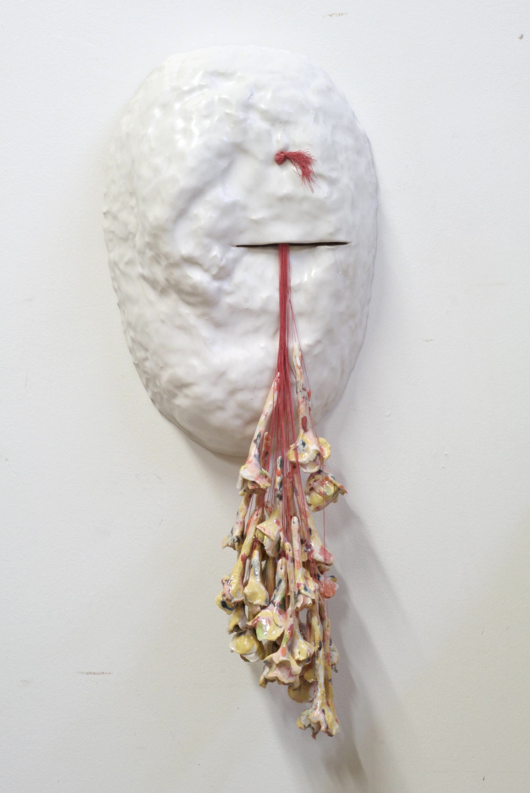 grès, porcelaine, émail, feuille d’argent, fils polyester