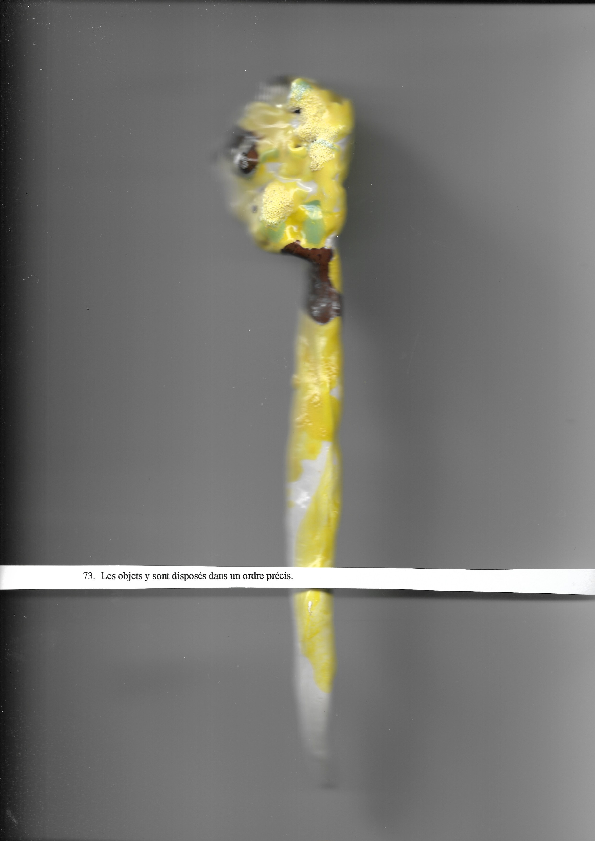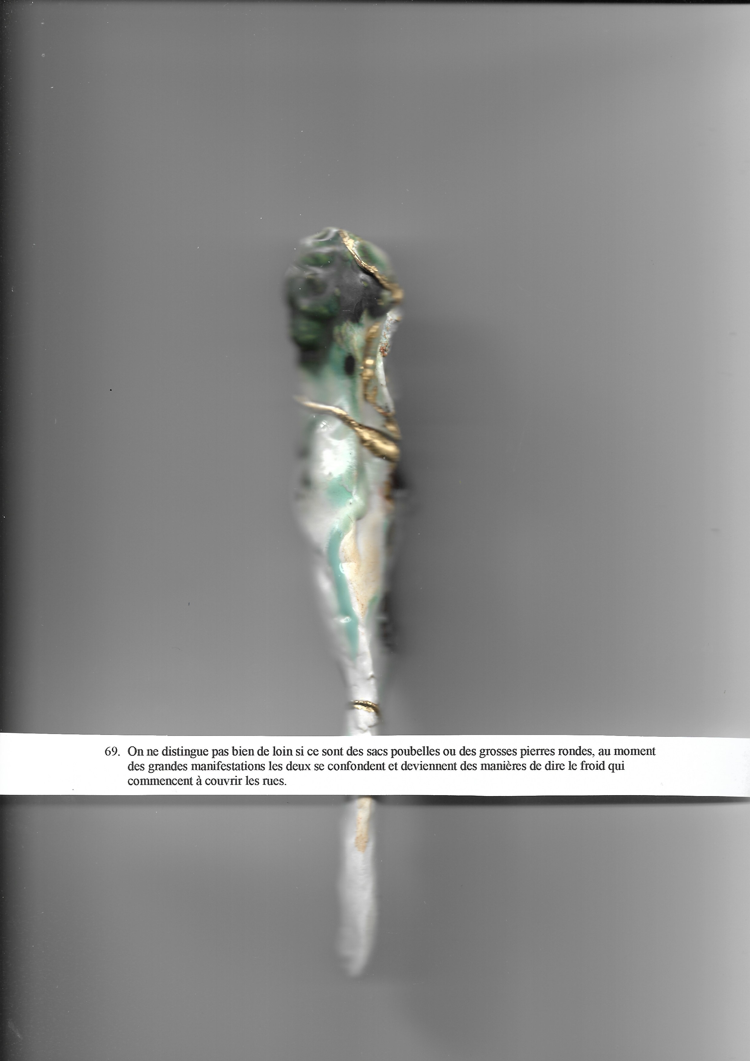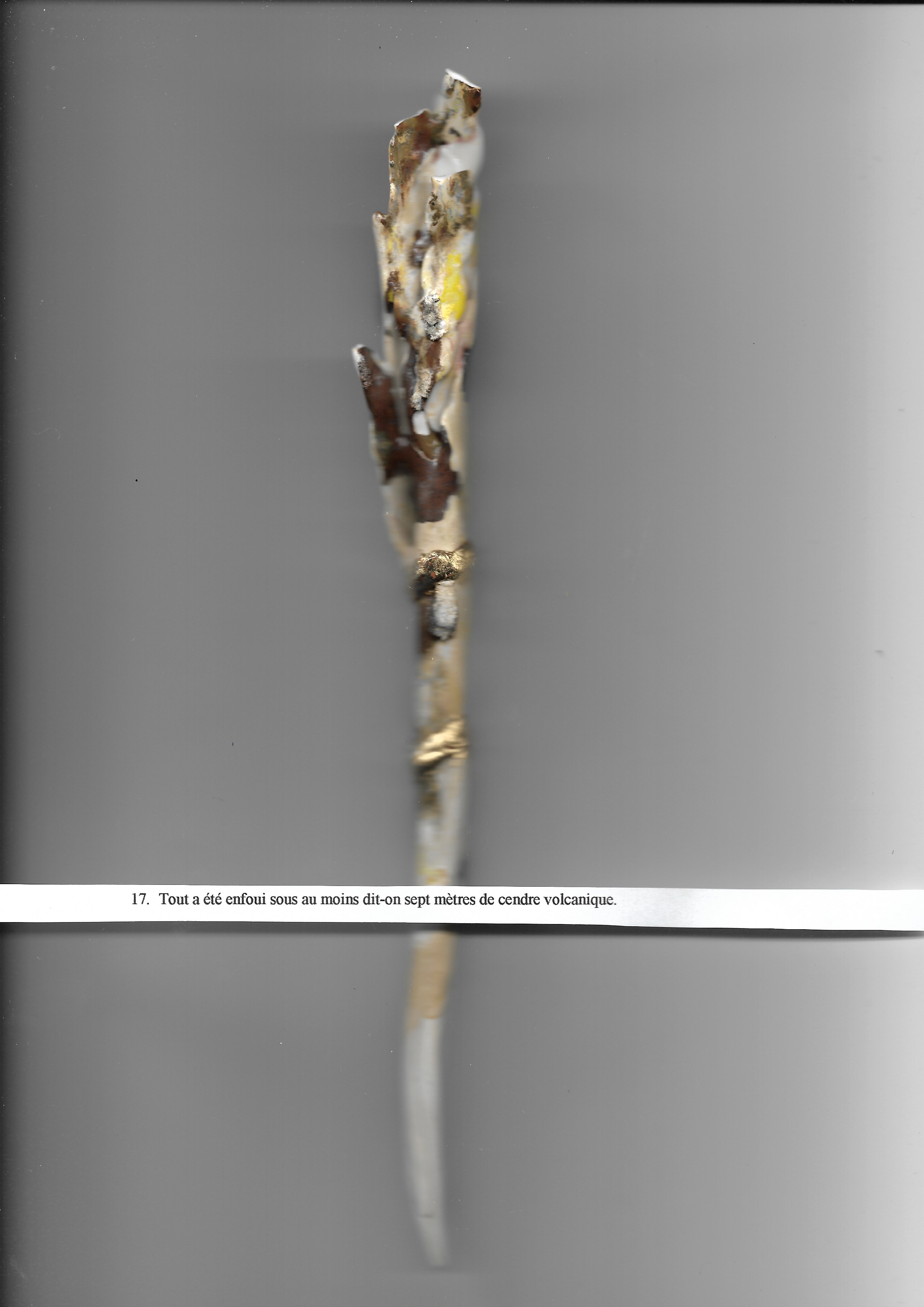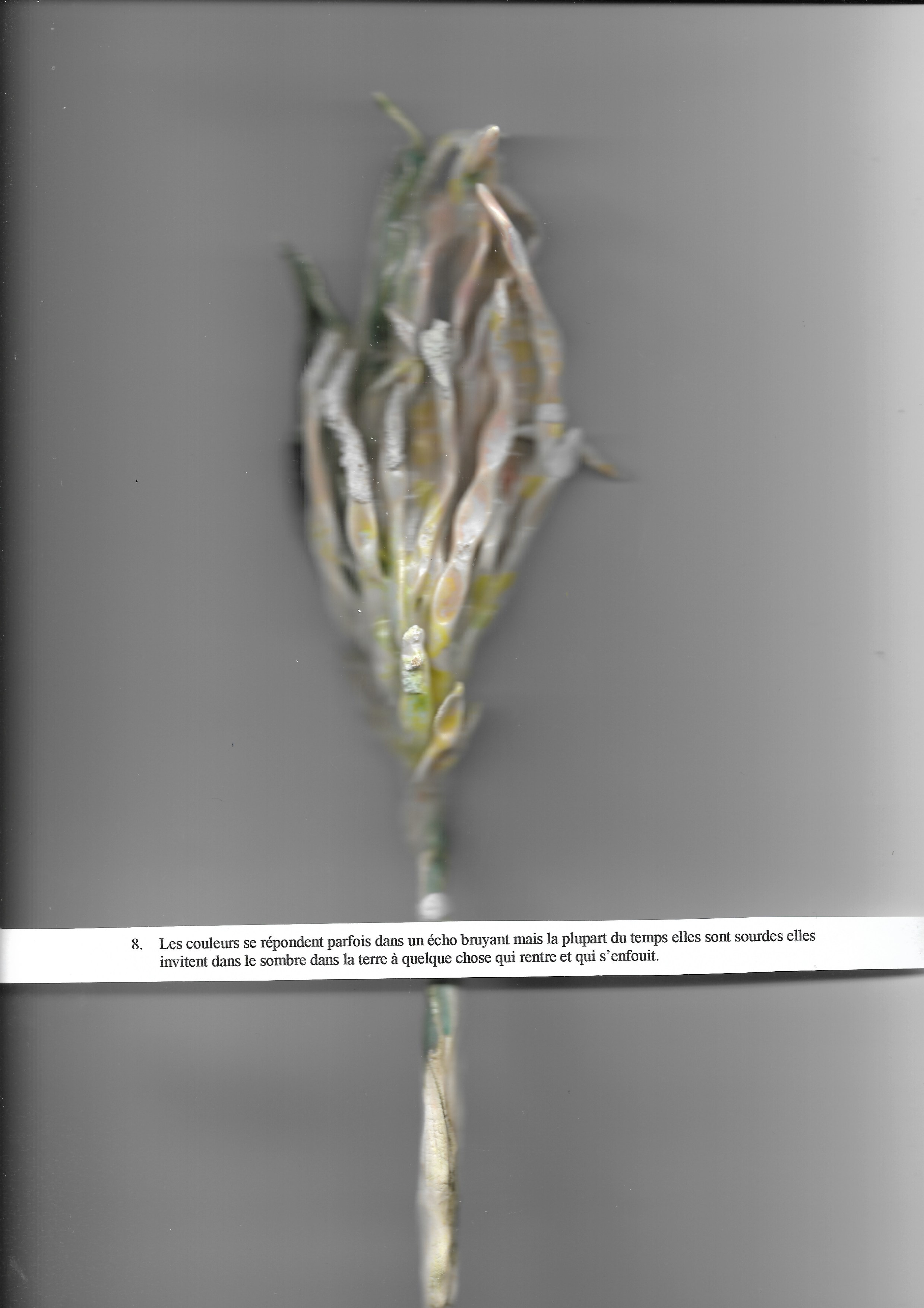 Parfois le détail est beaucoup plus fragile que cela : blanc c’est plus rare au milieu des cendres c’est beaucoup plus rare d’y trouver du blanc et encore du jaune du vert qui brille cette fois.