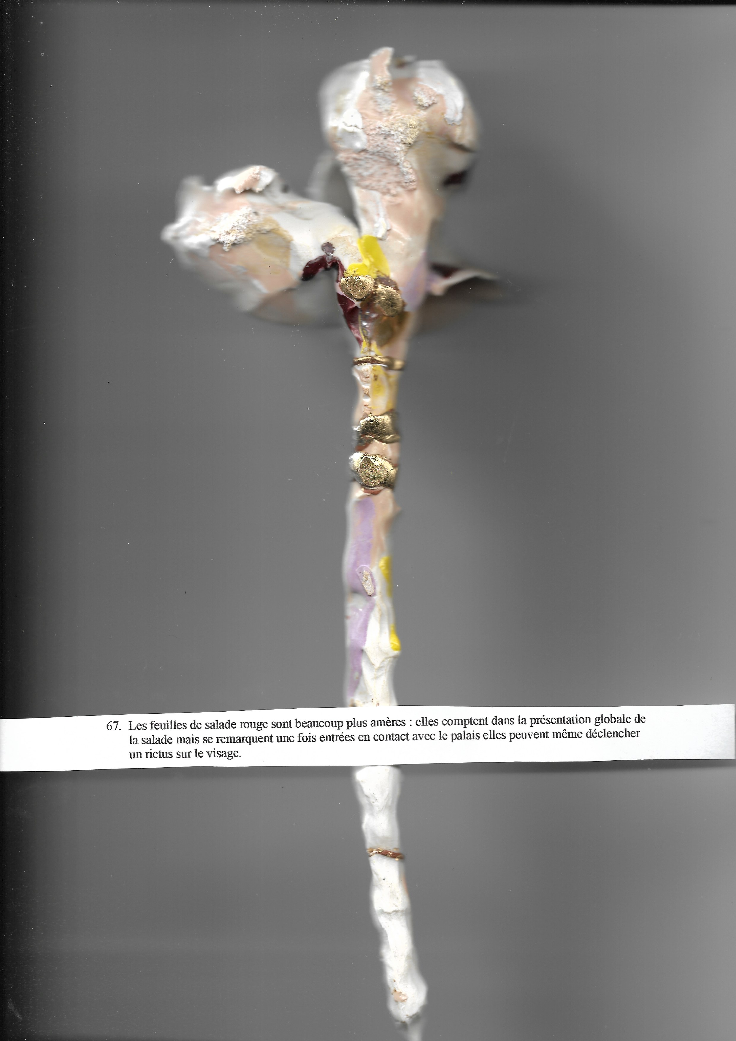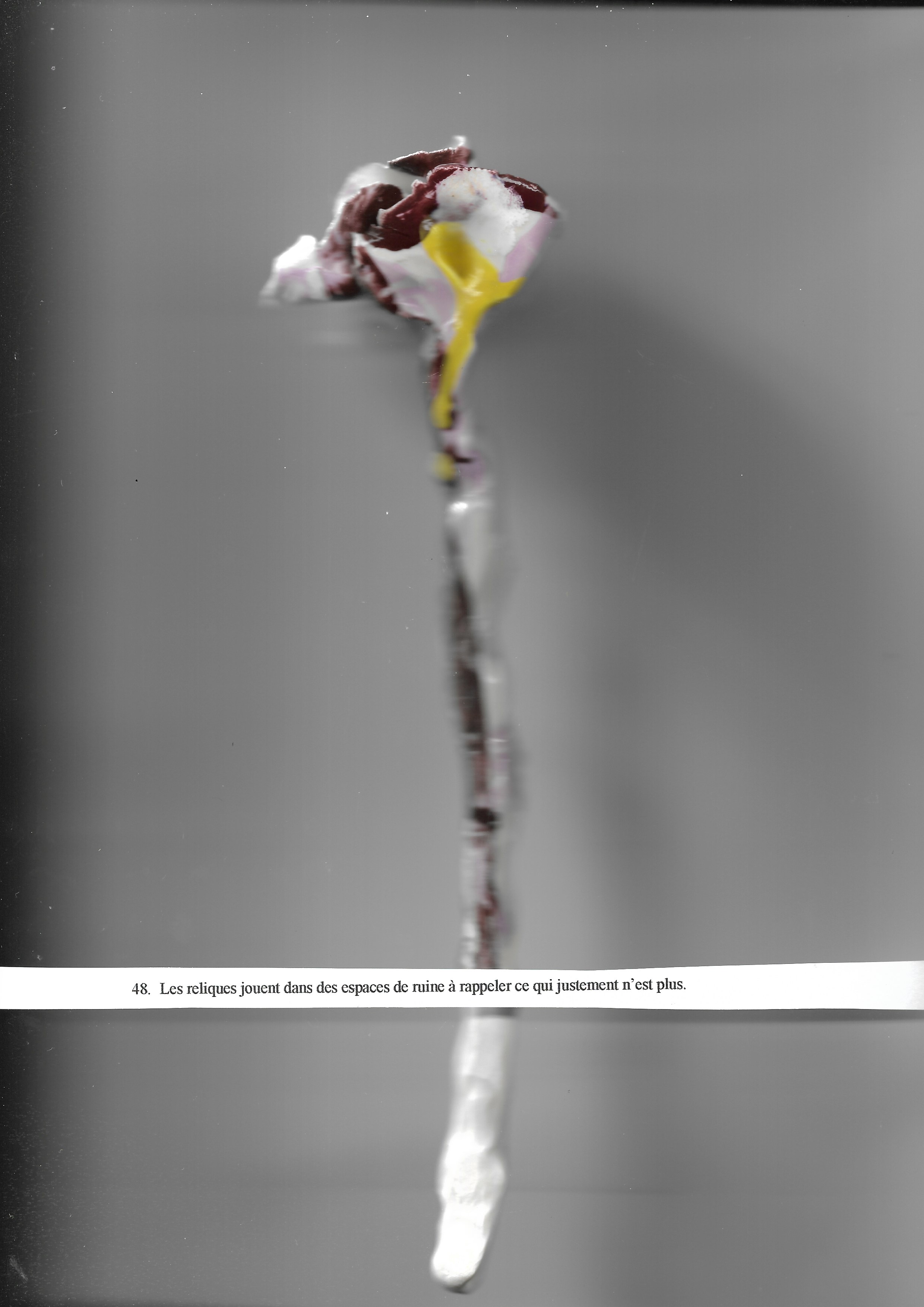 Les deux pétales correspondent aux deux lèvres d’un sexe ce moment où le corps est ouvert et invite à une coulée ici on voit que celle-ci est descendue jusqu’à l’extrémité de l’objet la coulure en est noire.