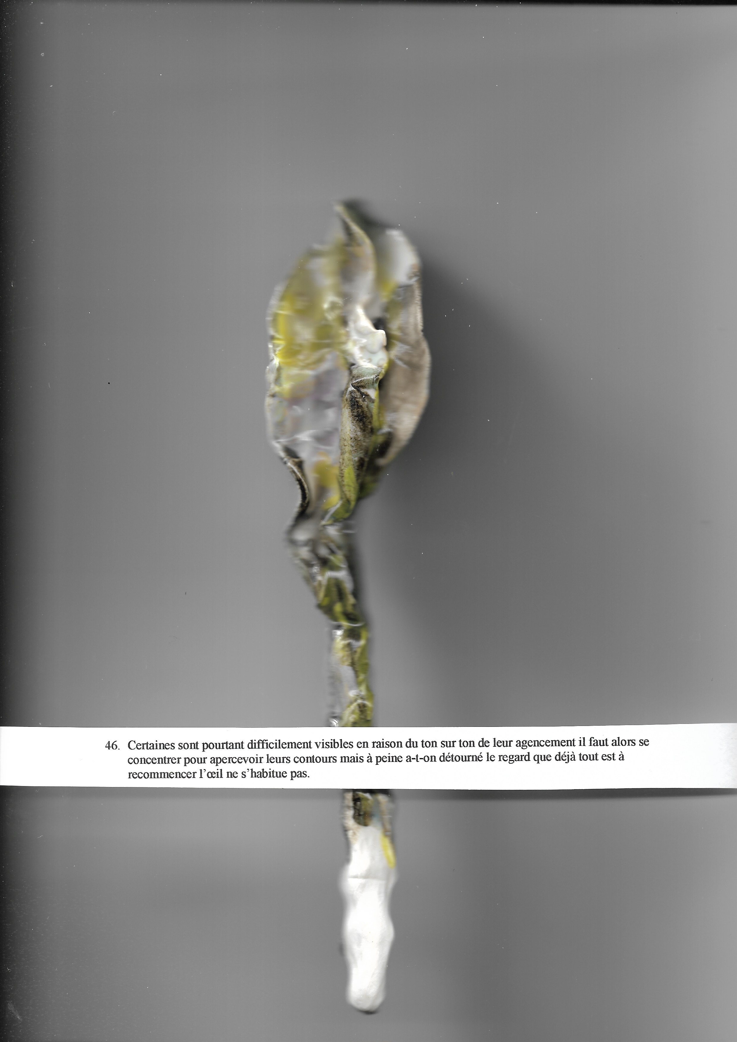 Certaines sont pourtant difficilement visibles en raison du ton sur ton de leur agencement il faut alors se concentrer pour apercevoir leurs contours mais à peine a-t-on détourné le regard que déjà tout est à recommencer l’œil ne s’habitue pas.