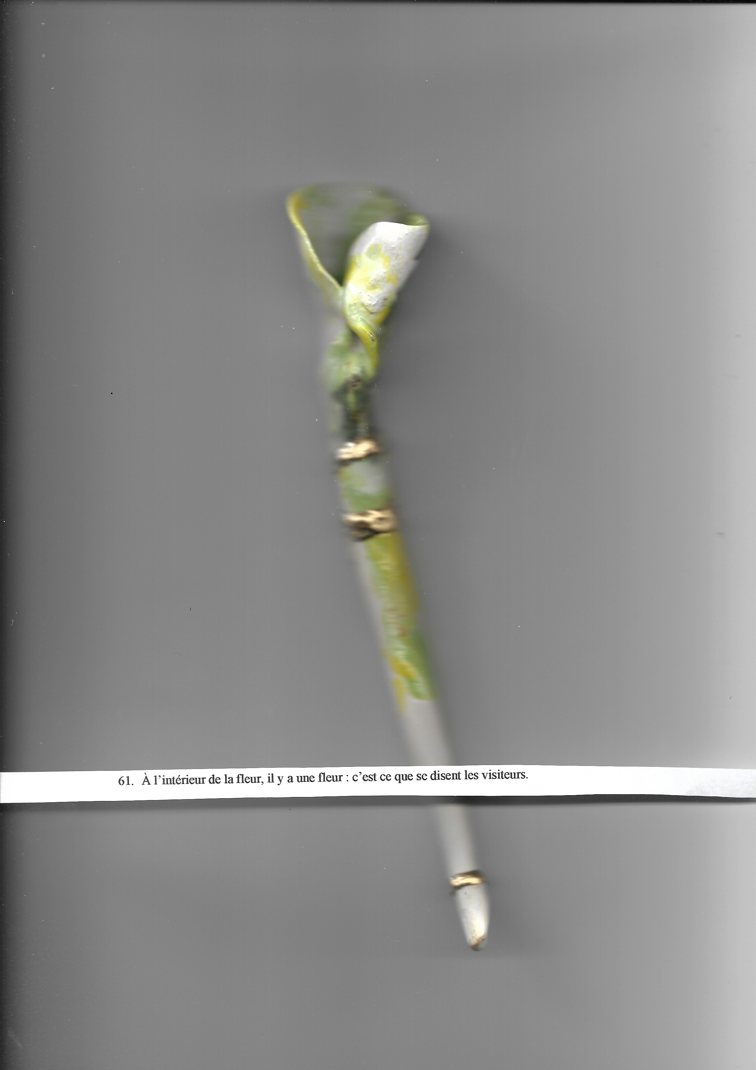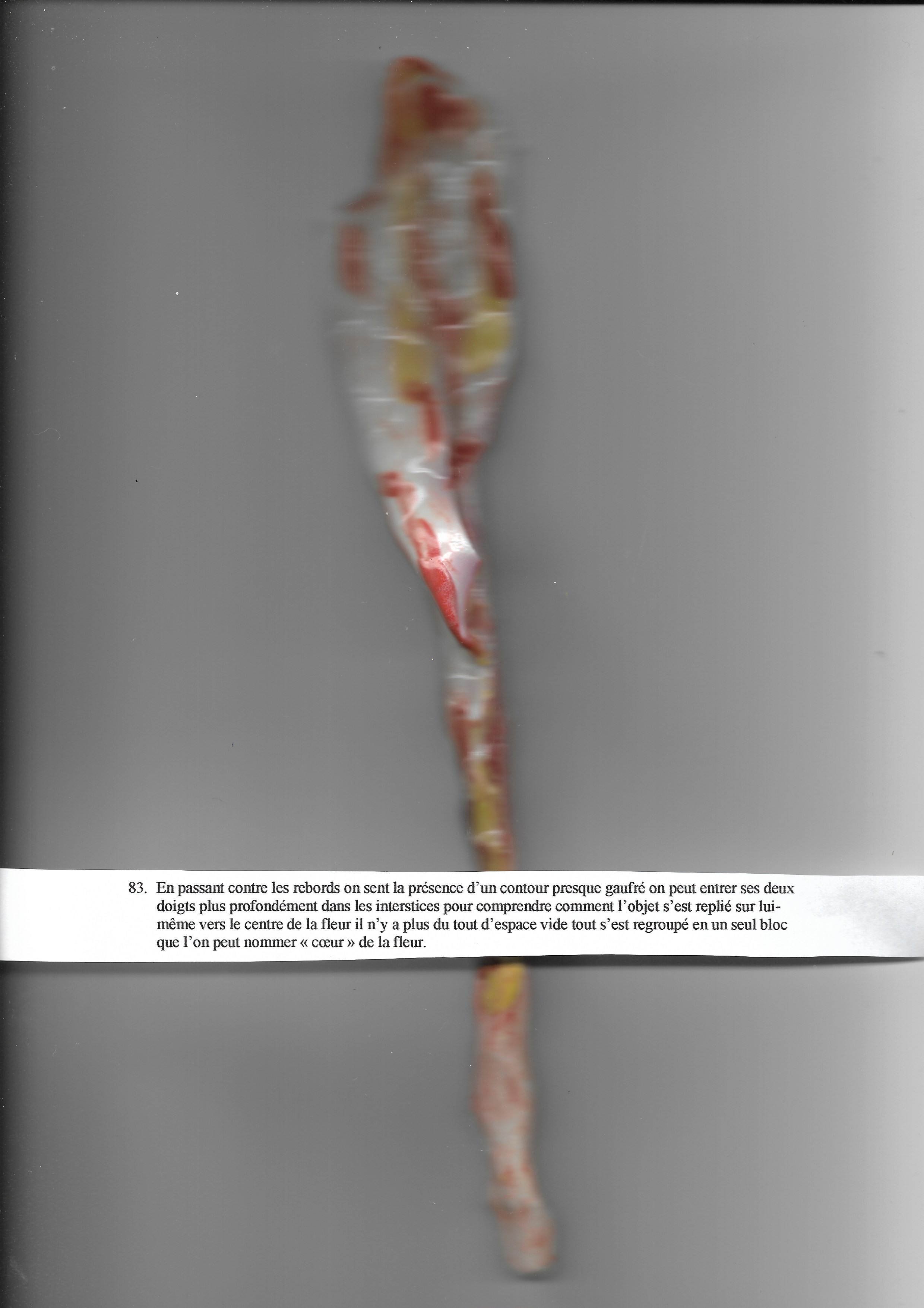 En passant contre les rebords on sent la présence d’un contour presque gaufré on peut entrer ses deux doigts plus profondément dans les interstices pour comprendre comment l’objet s’est replié sur lui-même vers le centre de la fleur il n’y a plus du tout d’espace vide tout s’est regroupé en un seul bloc que l’on peut nommer « cœur » de la fleur.