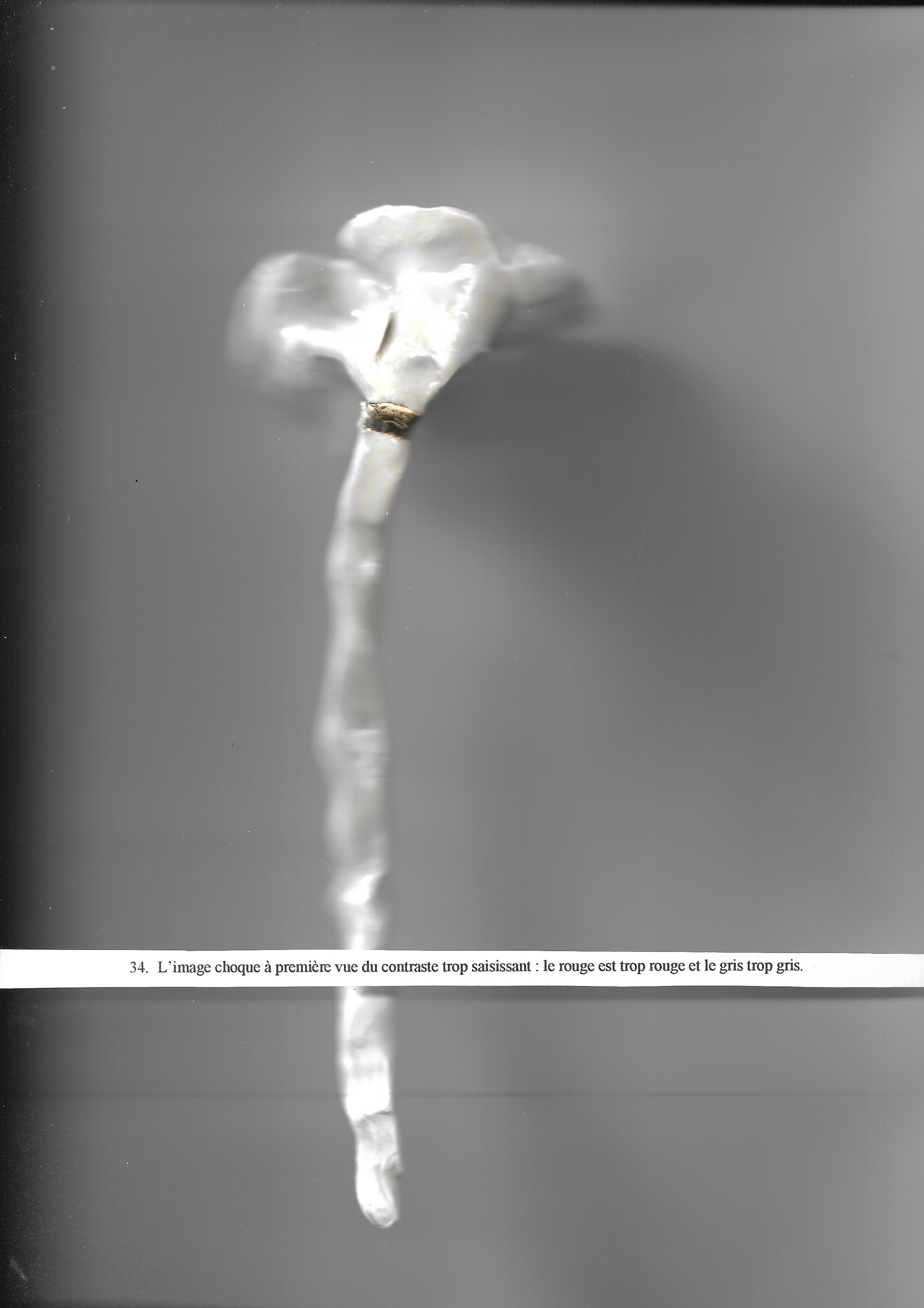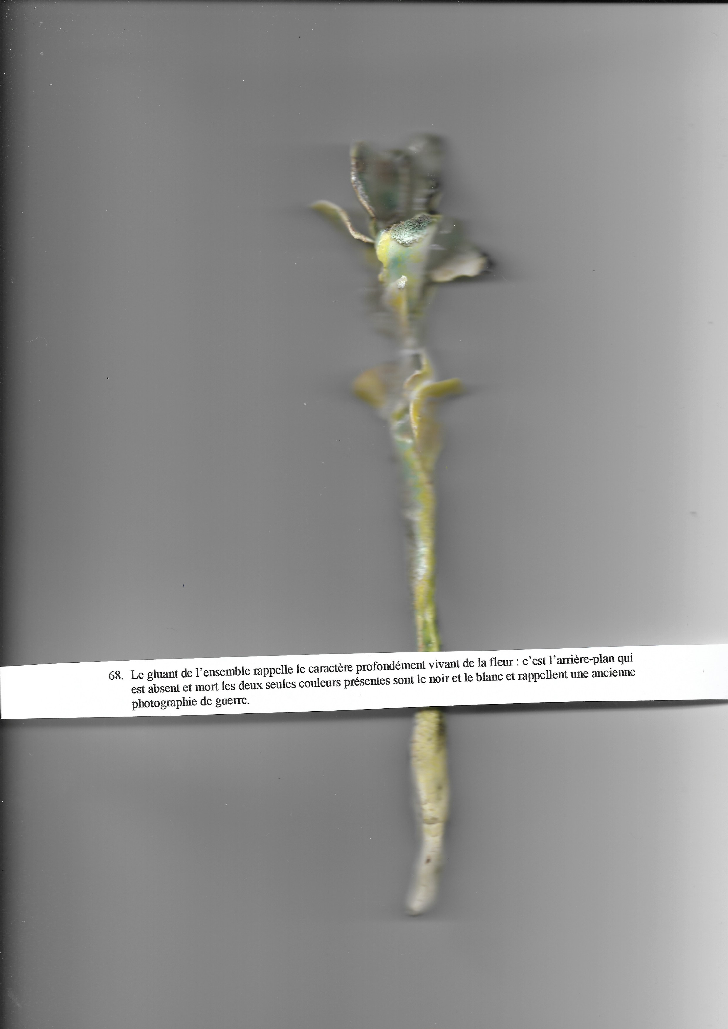 Le gluant de l’ensemble rappelle le caractère profondément vivant de la fleur : c’est l’arrière-plan qui est absent et mort les deux seules couleurs présentes sont le noir et le blanc et rappellent une ancienne photographie de guerre.