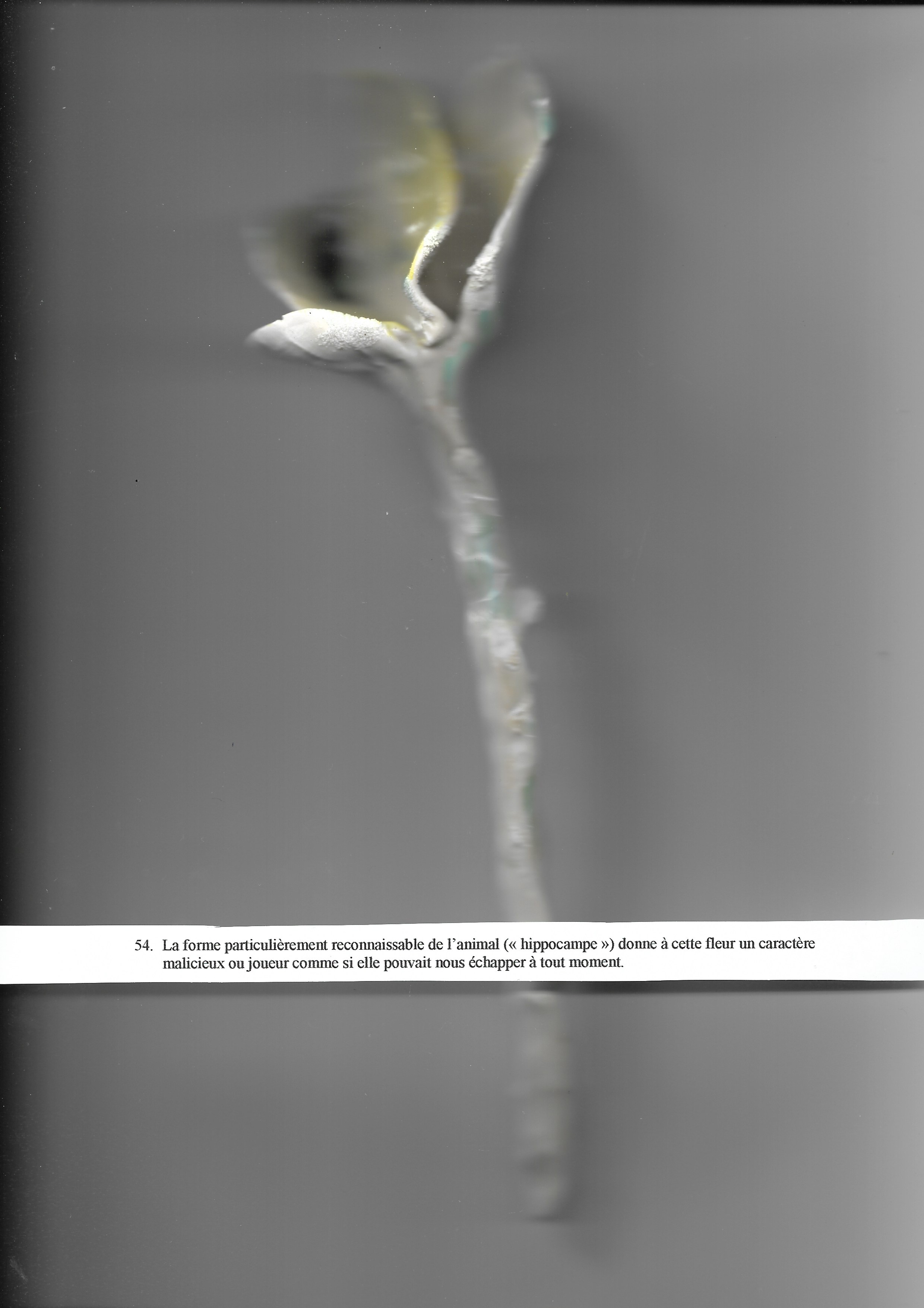 La forme particulièrement reconnaissable de l’animal (« hippocampe ») donne à cette fleur un caractère malicieux ou joueur comme si elle pouvait nous échapper à tout moment.