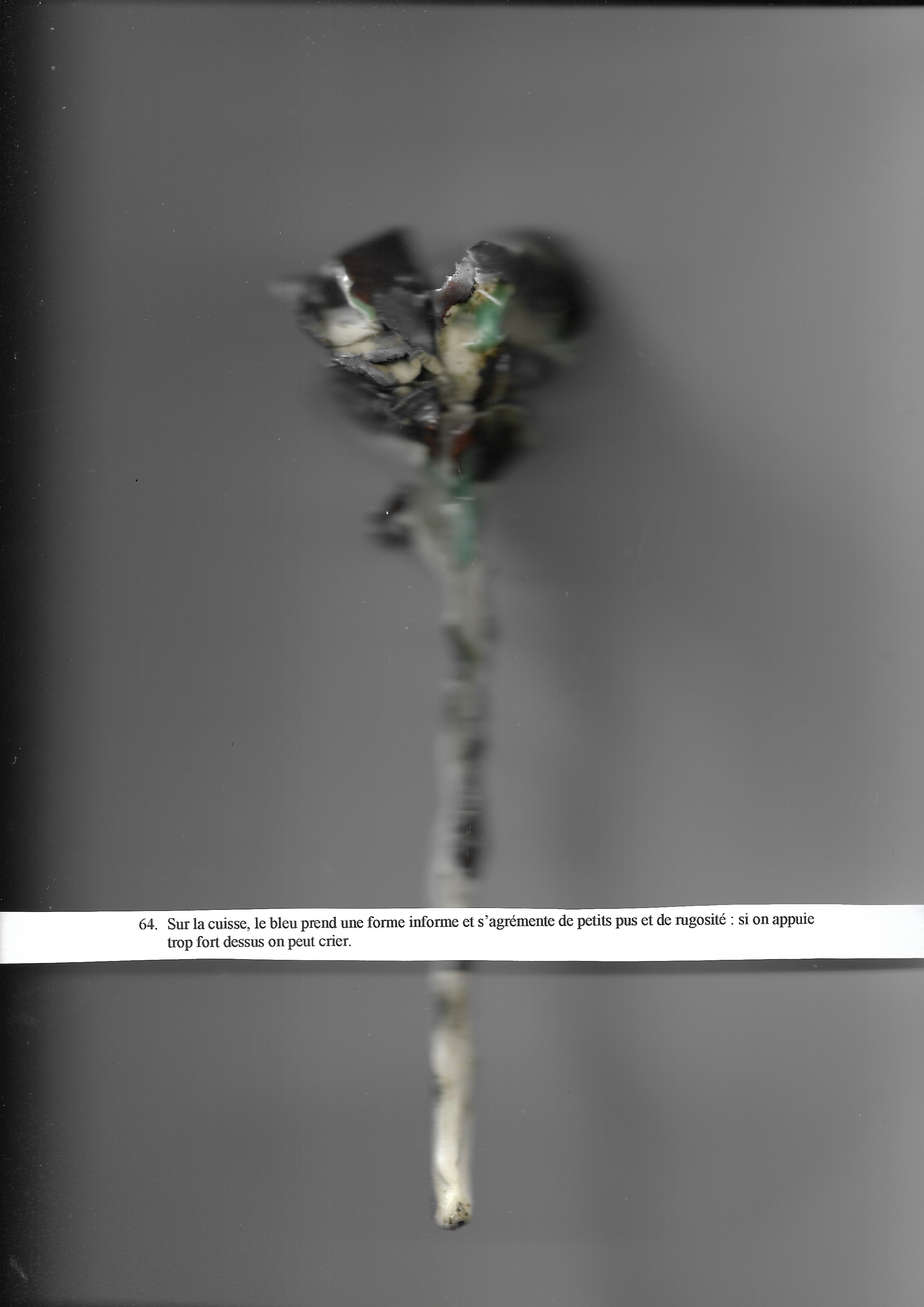 Sur la cuisse, le bleu prend une forme informe et s’agrémente de petits pus et de rugosité : si on appuie trop fort dessus on peut crier.