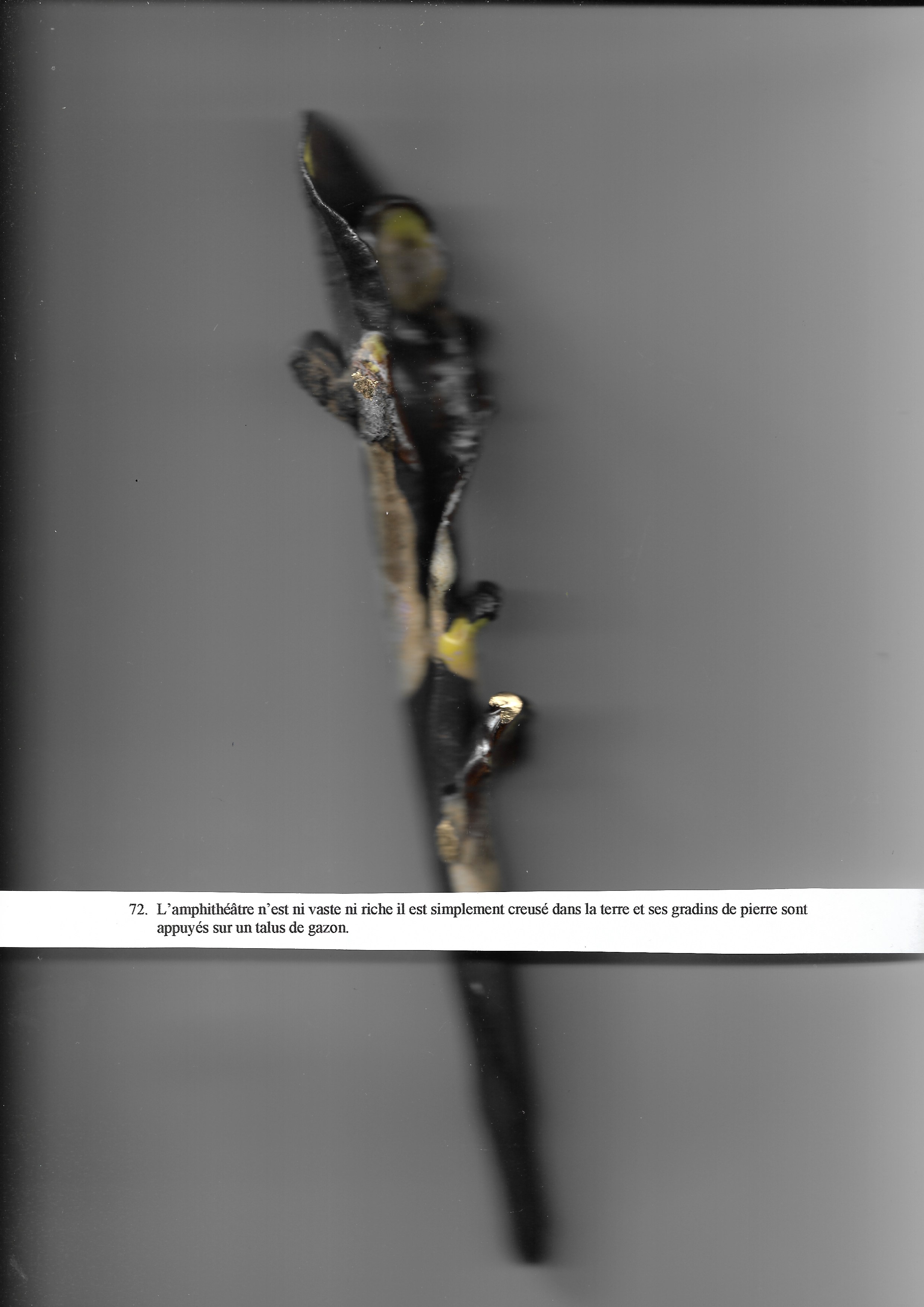 L’amphithéâtre n’est ni vaste ni riche il est simplement creusé dans la terre et ses gradins de pierre sont appuyés sur un talus de gazon.