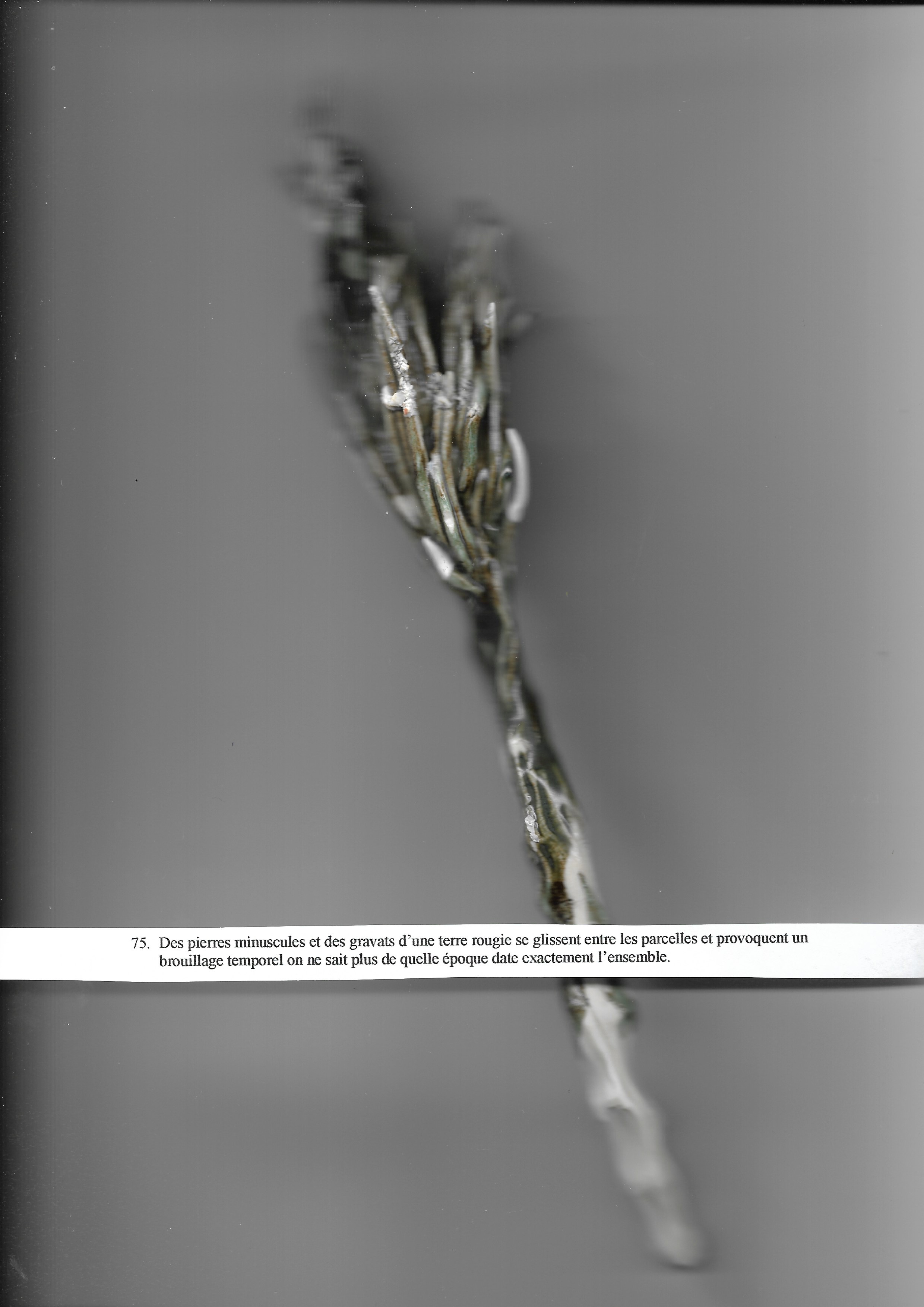 Des pierres minuscules et des gravats d’une terre rougie se glissent entre les parcelles et provoquent un brouillage temporel on ne sait plus de quelle époque date exactement l’ensemble.