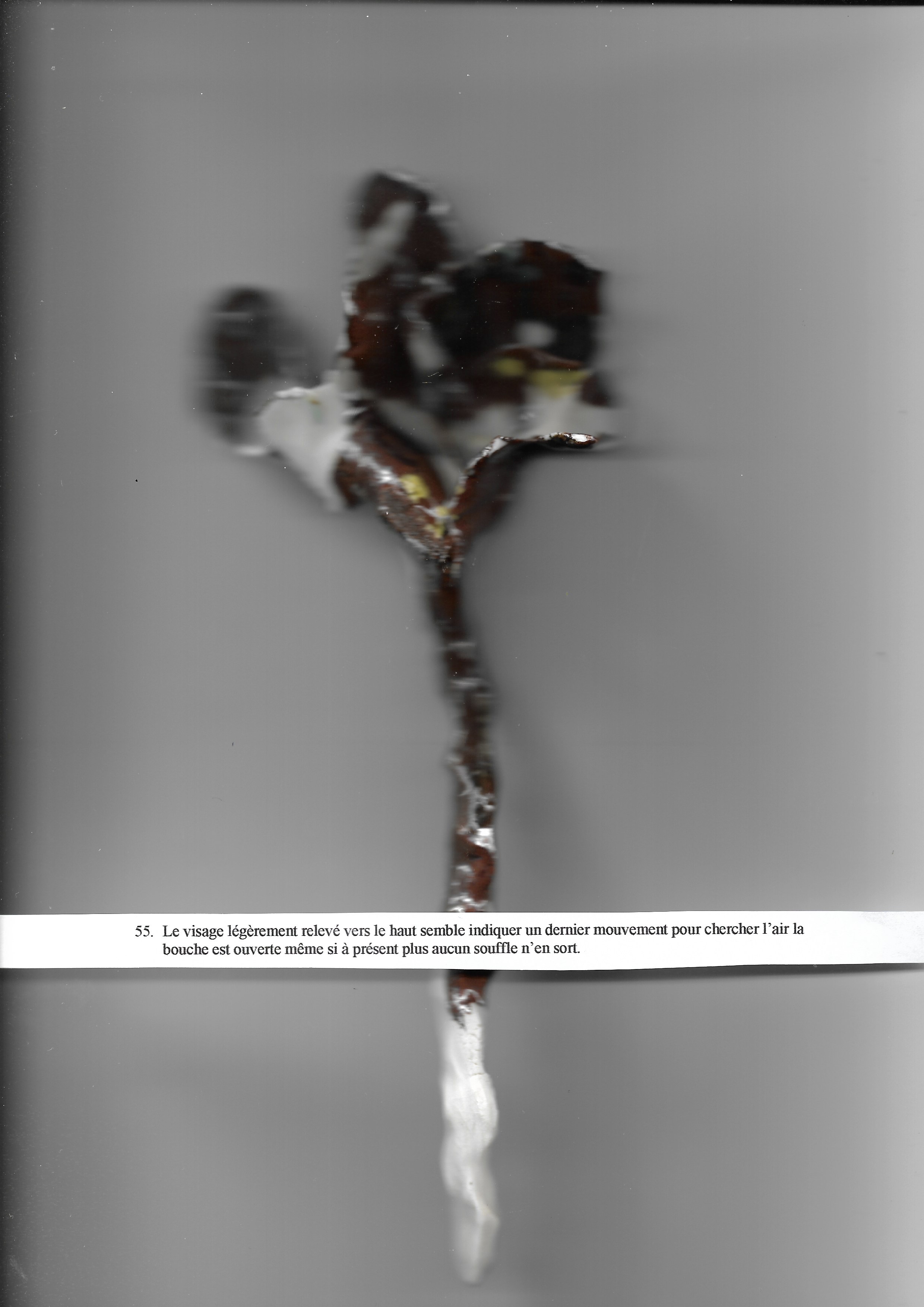 Le visage légèrement relevé vers le haut semble indiquer un dernier mouvement pour chercher l’air la bouche est ouverte même si à présent plus aucun souffle n’en sort.